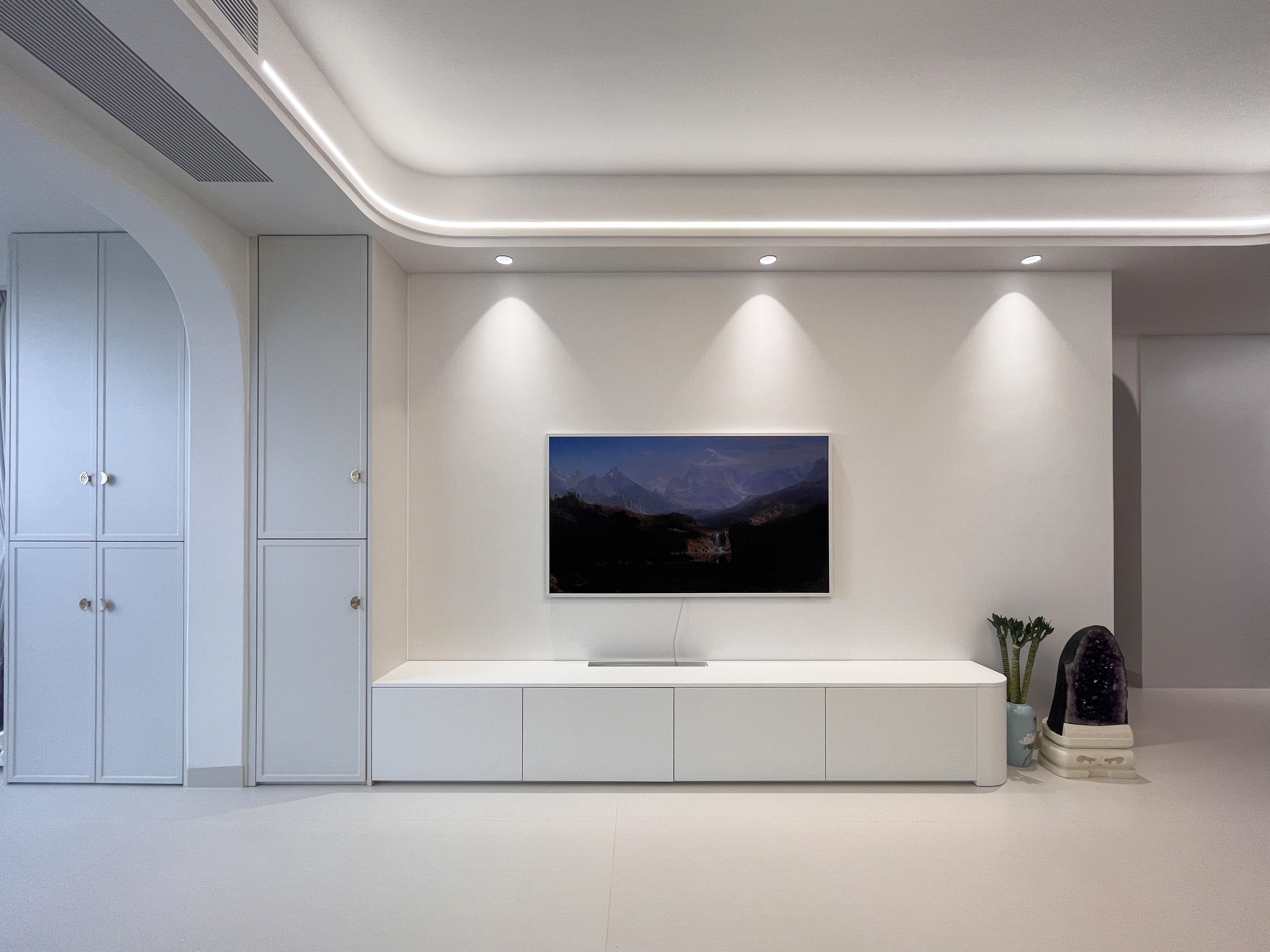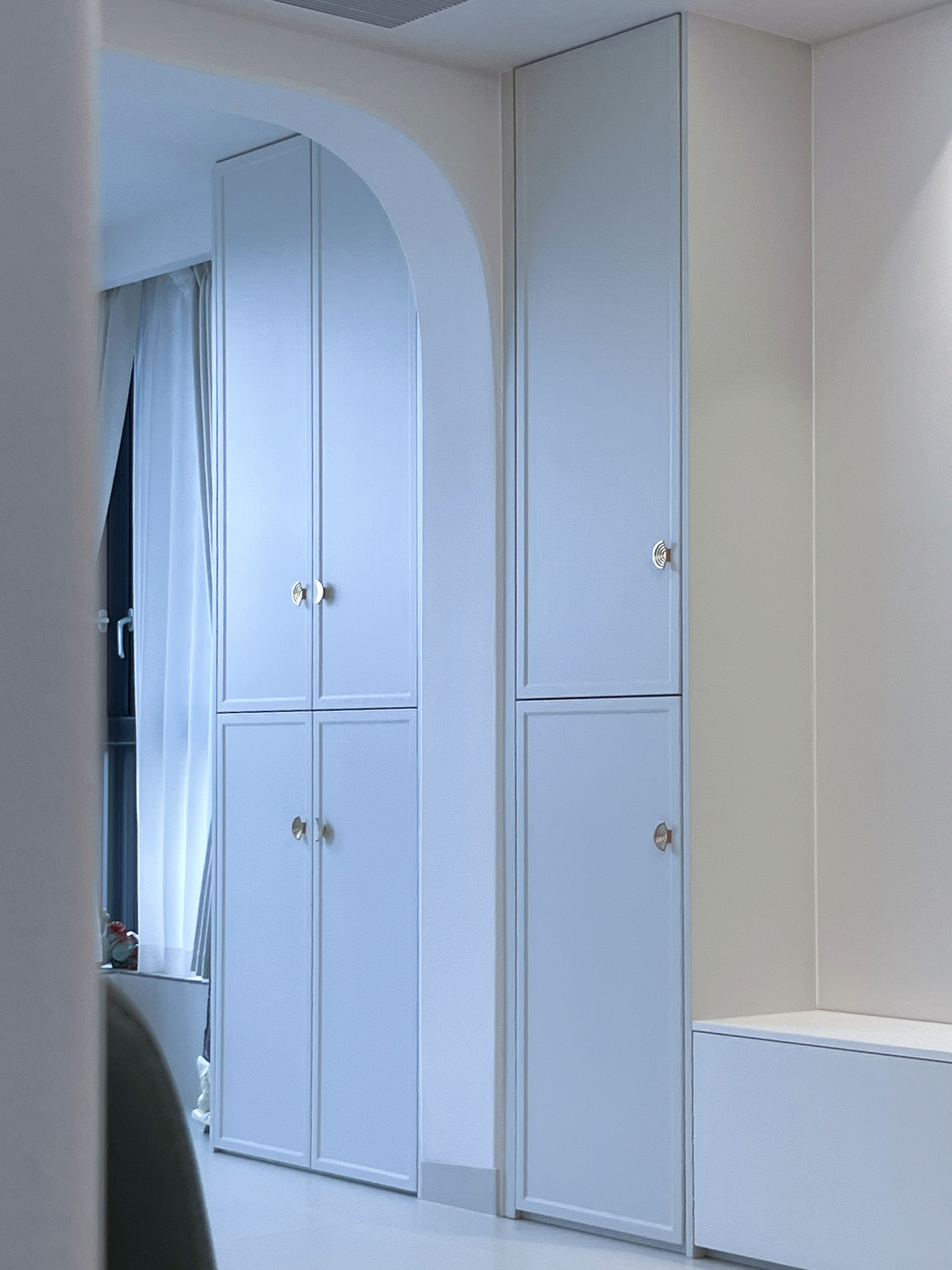 主臥的柜子顏色選擇也依然采用白色,整體的造型都是精心設計的成果落地,高質感把手像是一面精致柜門的點睛,構造出了一排精致簡約的柜子。