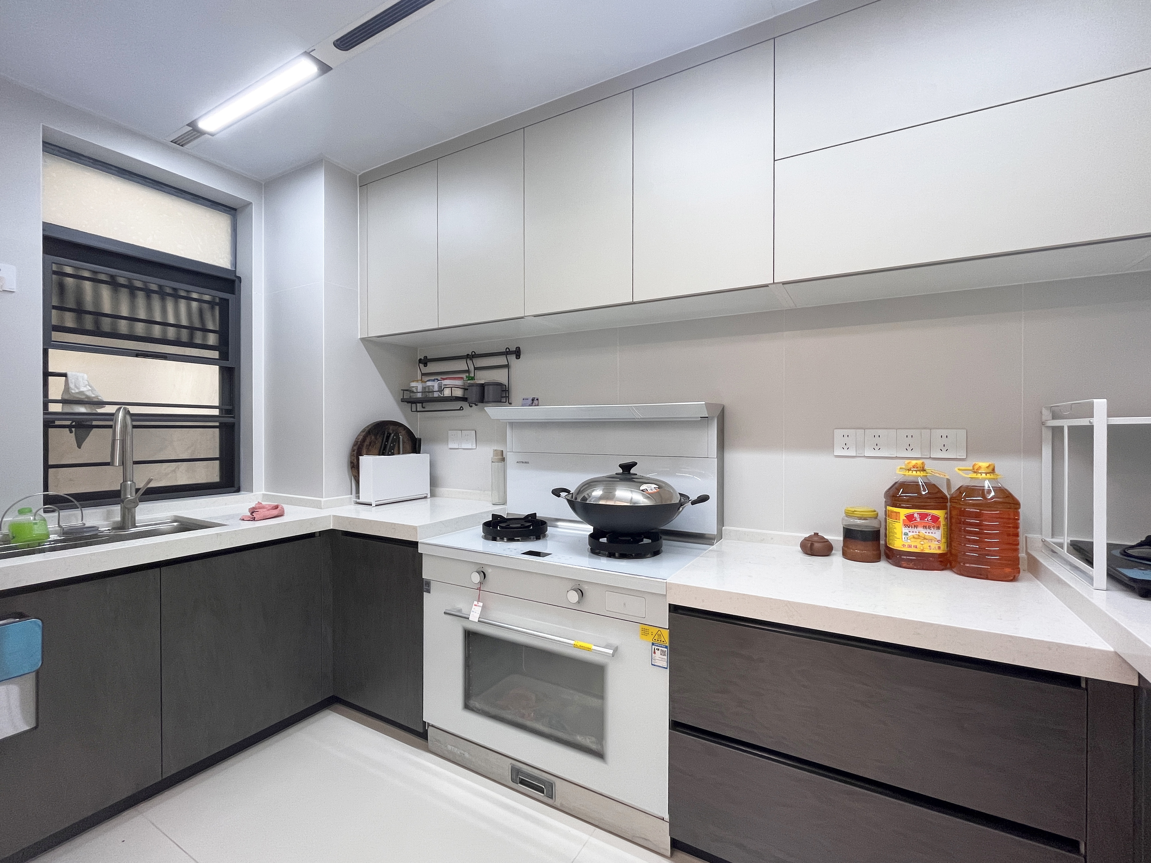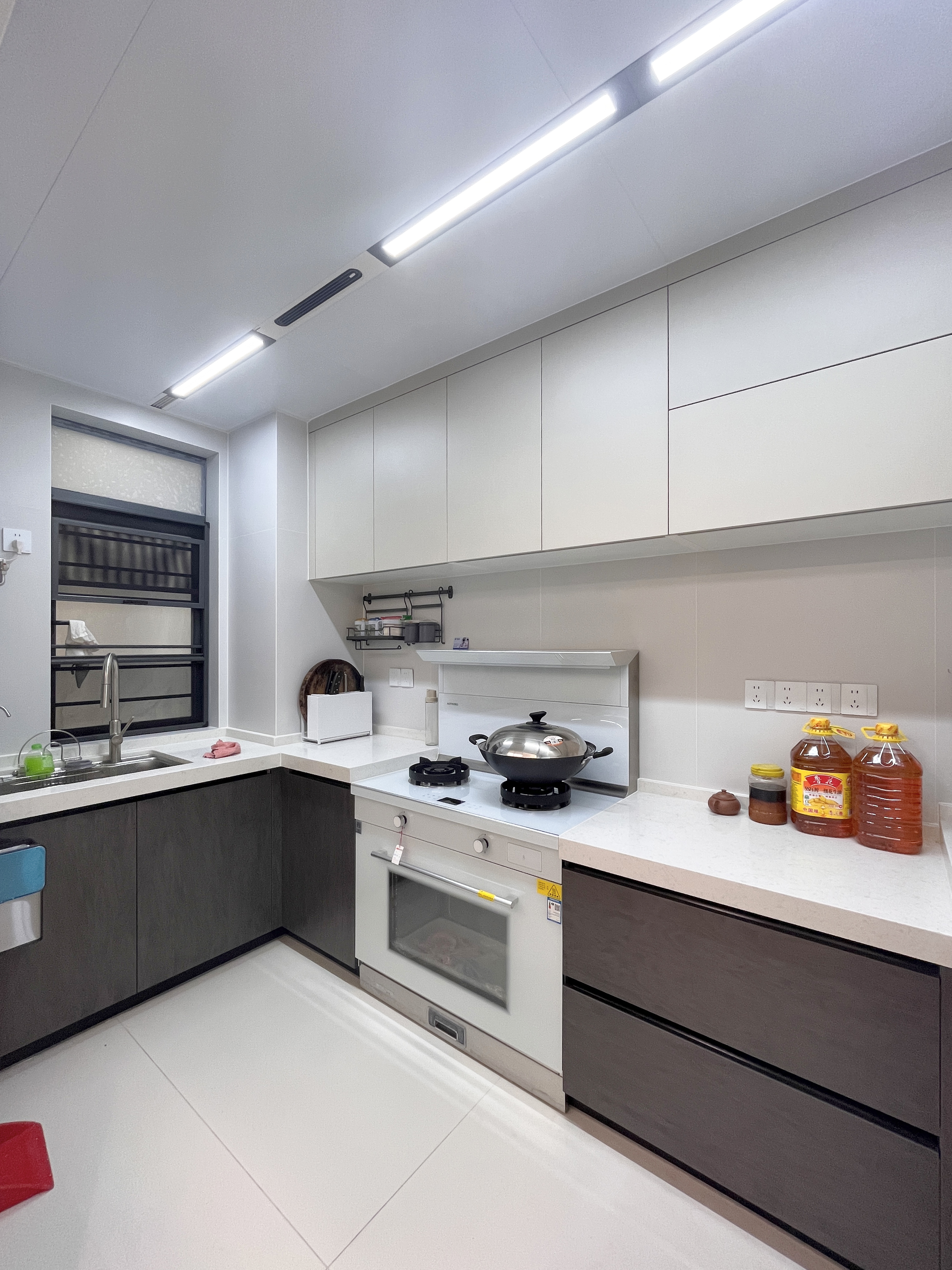廚房推拉門的選擇跟整體的色調很呼應,一扇門隔開一個油煙空間,保證油煙不外竄。廚房內部色調上的搭配除了盡可能與整體風格搭配以外,還選擇了相對來水比較耐臟的櫥柜顏色,下面部分如果有了水漬也比較容易清理,而上部分的櫥柜則是能最大限度地與公共空間融合,增加視覺上的空間感。
