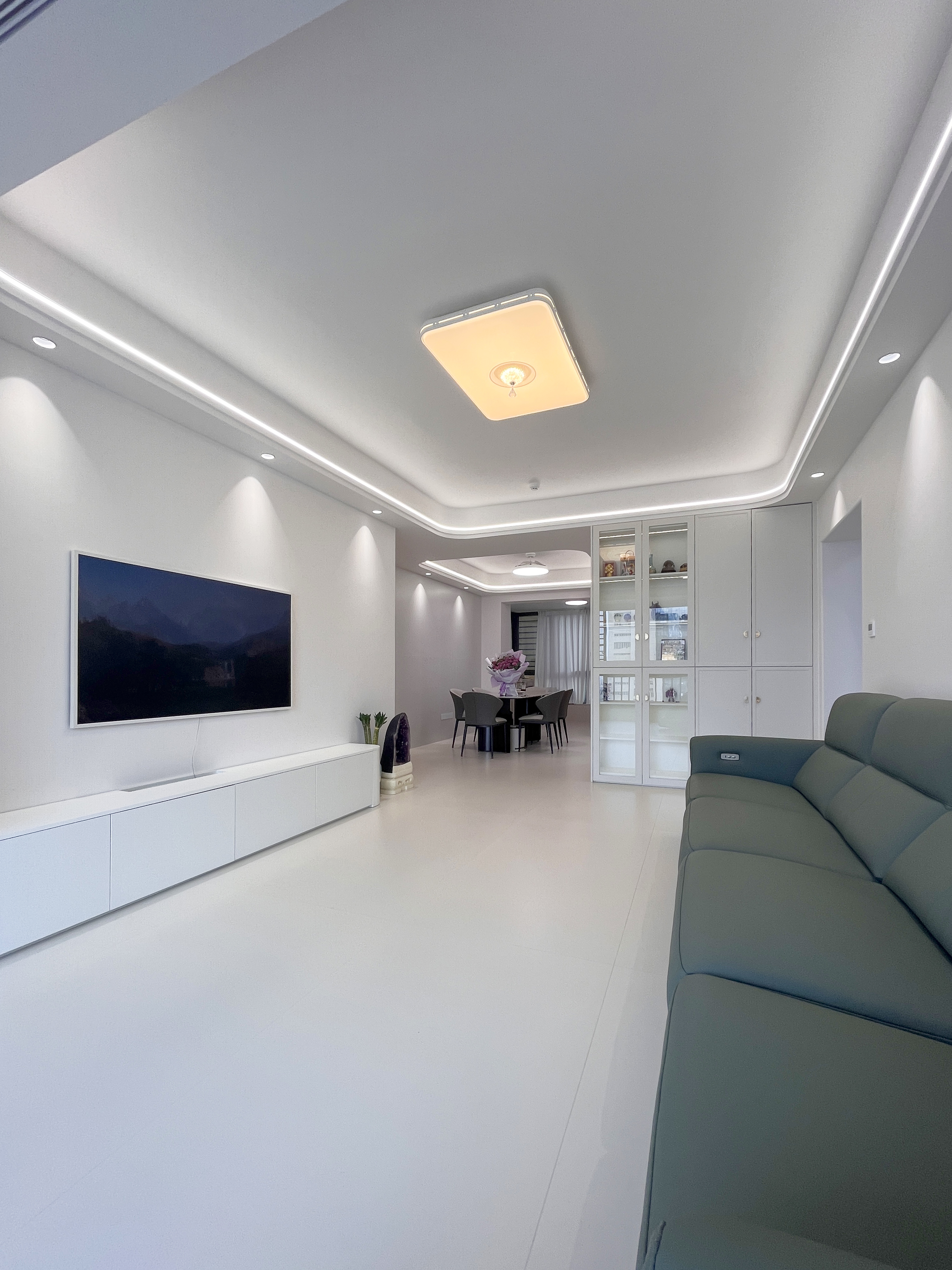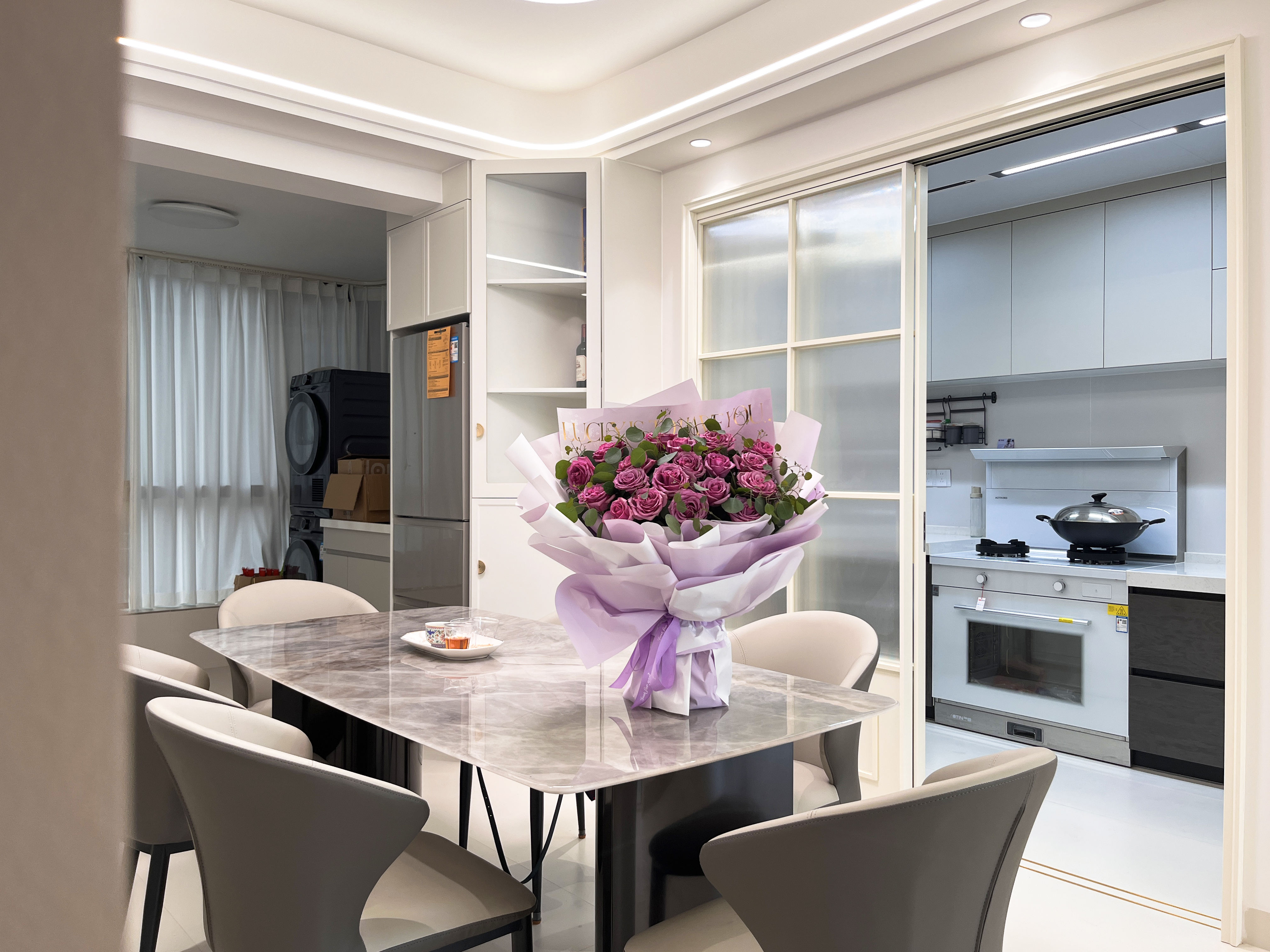 餐廳位置頂上做了專屬空間的吊頂,和客廳形成邊界,在原來的基礎上增加了立體空間感,選擇一個長桌做軟裝的布置,很大程度增加了家里人走動的公共空間,主燈燈光落下,能很好的營造空間的氛圍感。