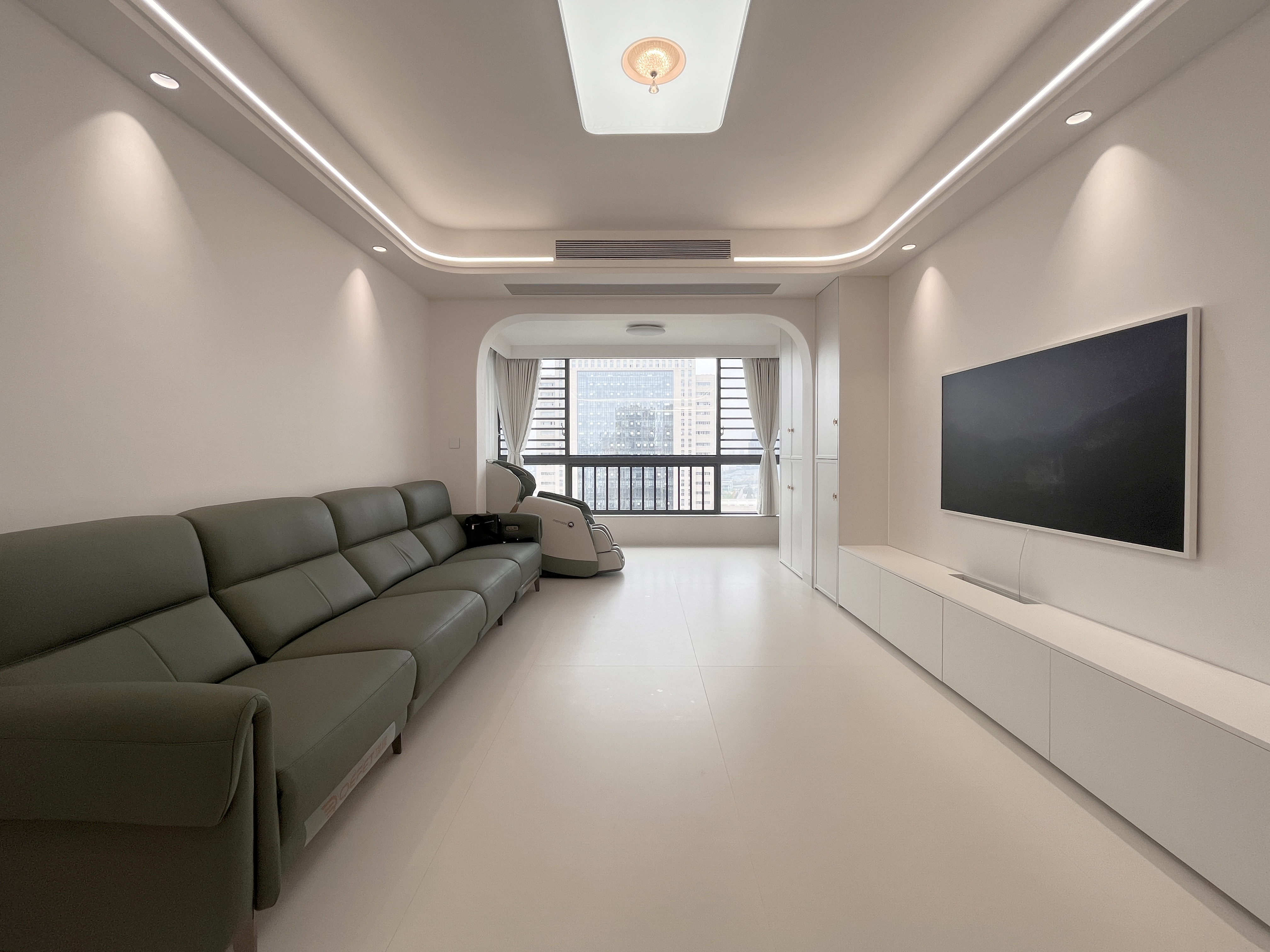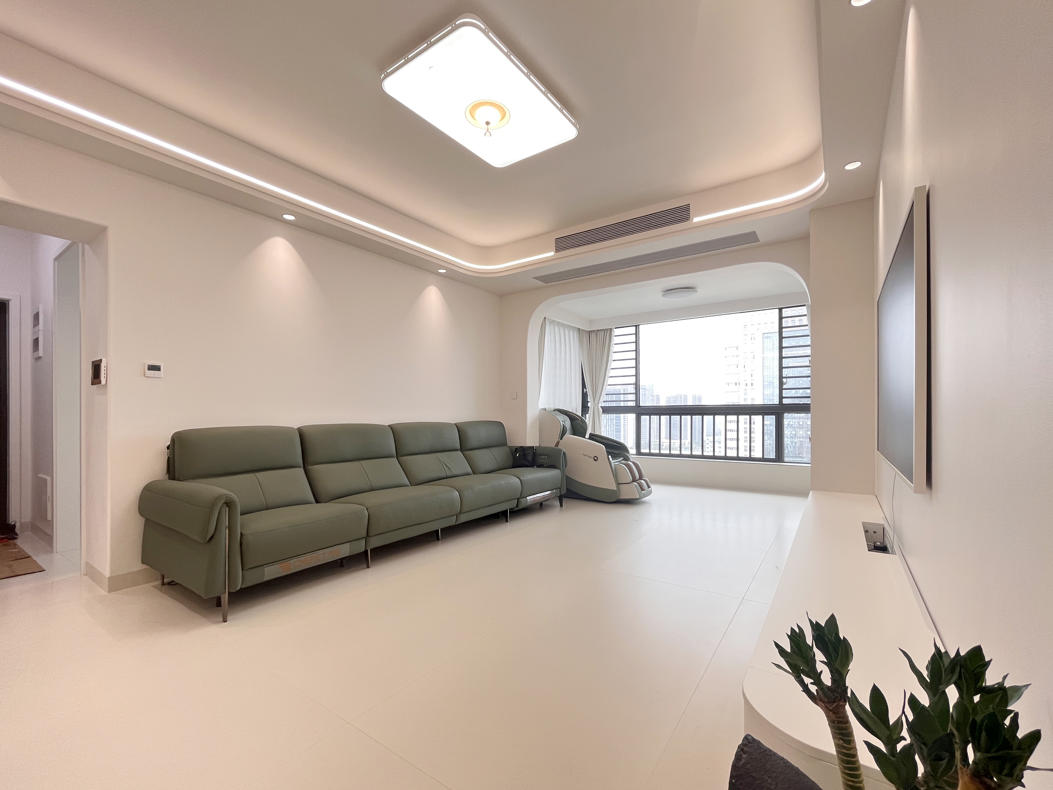 客廳入目就是很純白的色調,有一種高級的留白感,除去白色,沒有多余的顏色“喧賓奪主”,雙眼皮吊頂在造型上加了燈帶,溫馨的燈效能夠增添視覺上的溫馨以及高級感,電視背景墻利用簡單的落地柜實現(xiàn)了一部分的收納,實用且美觀??蛷d的軟裝主要以簡約為主,目前只添置了一個沙發(fā),綠色的顏色選擇給空間很清新的感覺,有很大的視覺跳躍感。