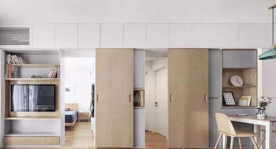 小戶型空間小,但是臥室門、衛生間門、廚房門一樣都不能少,這樣一來,整體的空間就會顯得混亂。這時候,設計師往往會把其中的一兩扇門設計成隱形門,簡化空間。