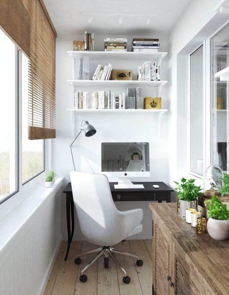 陽臺裝成工作區(qū)的步驟也是很簡單的,只需要在陽臺擺上一桌一椅,在靠墻的地方安裝一面書柜,或者幾張置物隔板,就成了簡單有效的工作區(qū)。