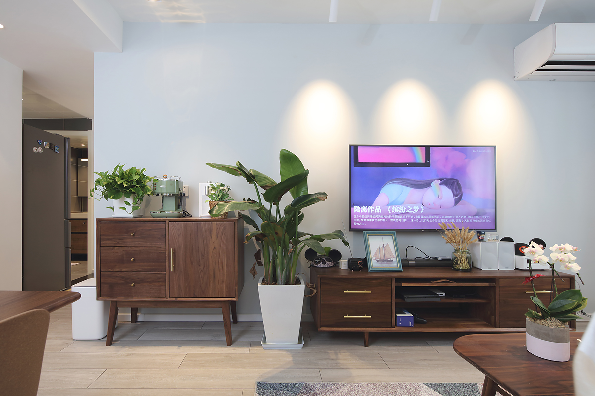 電視背景墻使用的是清新的淡藍色,簡單自然,在射燈的映襯下溫馨舒適。