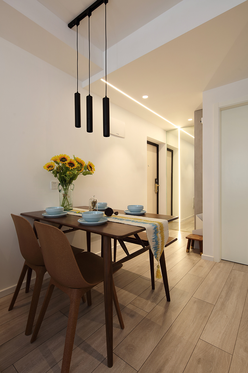 戶型面積小,并沒有單獨為餐廳留出的空間。設計師只是在客廳和玄關的空余地,擺置了一套桌椅,就完成了餐廳的打造。