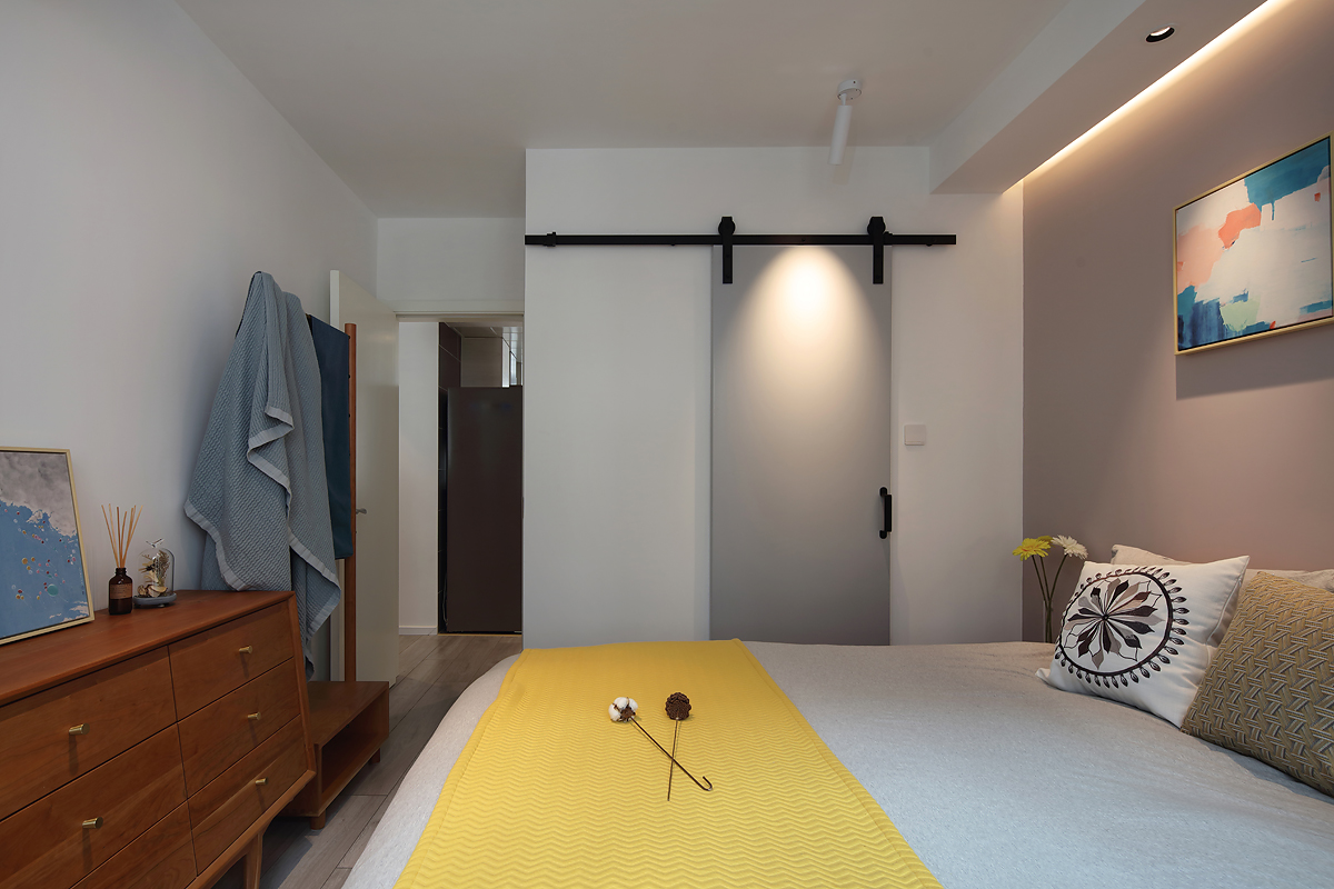 臥室的主色調是灰與白,床頭柜和儲物柜跟客廳的家具屬于同一系列,滿滿都是復古風,彰顯生活品味與家居格調。