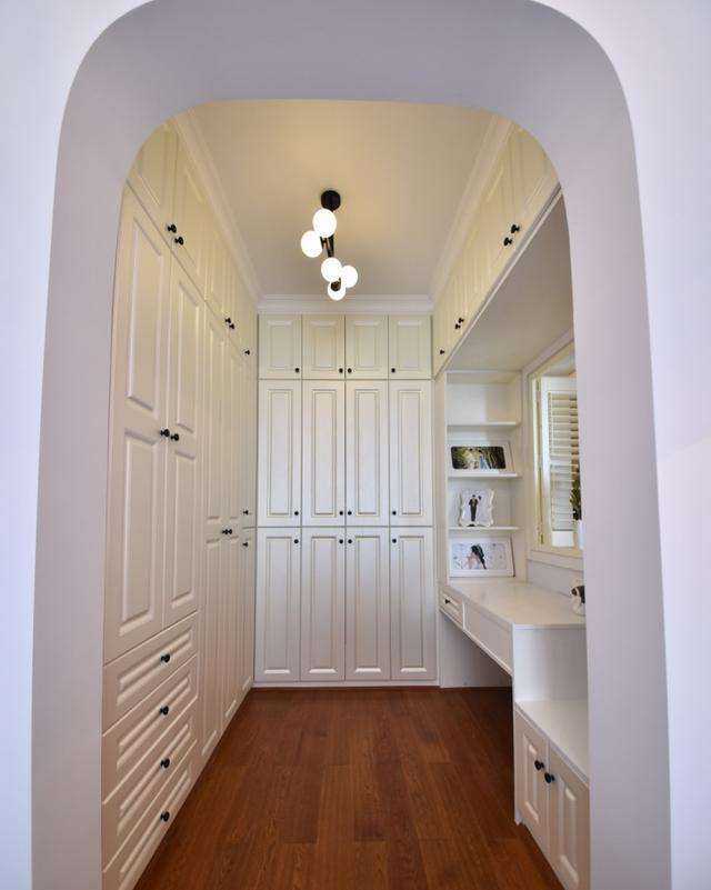 嵌入型的衣帽間能最大程度上節(jié)約空間,只需要空出一個(gè)3-4平米的小地方,安裝好衣柜以及鏡子,就能成為一個(gè)小型的衣帽間。平開門的衣柜或者不適合用在此處,可以考慮選用推拉門的設(shè)計(jì),或者選用布簾進(jìn)行遮擋,防止進(jìn)灰。