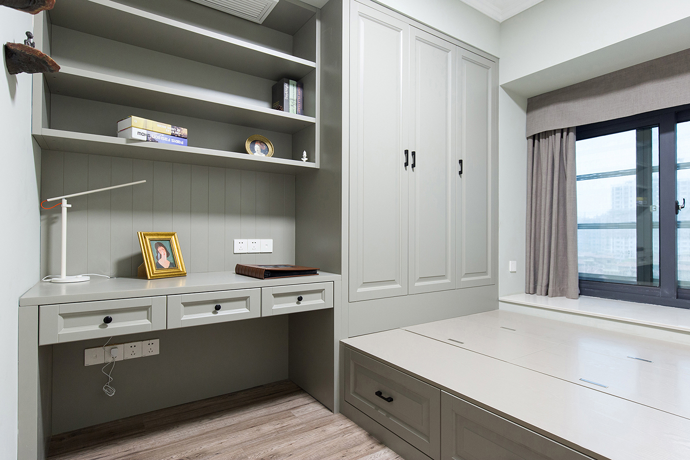 次臥的榻榻米組合柜也是清新淡雅的淺綠色