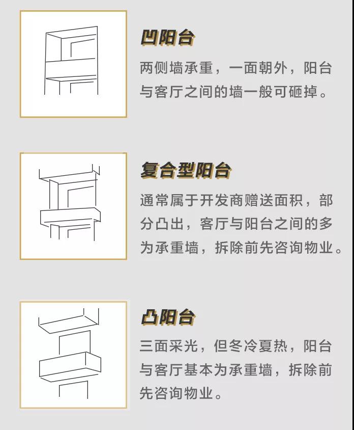 現在房子的陽臺類型可分為三類:凸陽臺、凹陽臺、復合型陽臺,不清楚自家客廳與陽臺之間的墻能不能拆的小伙伴們可以咨詢物業進行了解,再進行設計裝修。