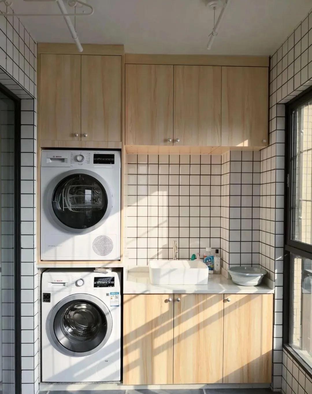 如果你家的陽臺只能半打通那可以設計成家務陽臺,在陽臺的一側放置洗衣機、烘干機、洗手臺,滿足日常洗衣需求,另一側安置儲物柜,收納平時用的生活用品,或擺放上提高客廳美感的綠植或飾品。