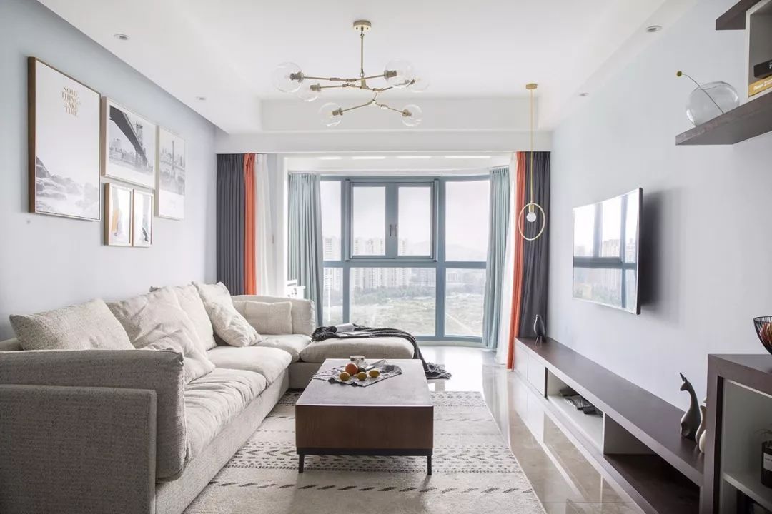 客廳與陽臺之間如果不是承重墻的話,可以全部拆掉,直接將陽臺納入客廳,打造一個超大空間的客廳空間。