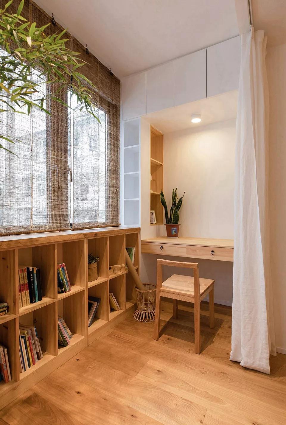 如果家里沒有書房的話,還可以在陽臺上做個書桌,使用時拉上內側窗簾就可以隔出一個小書房進行辦公。