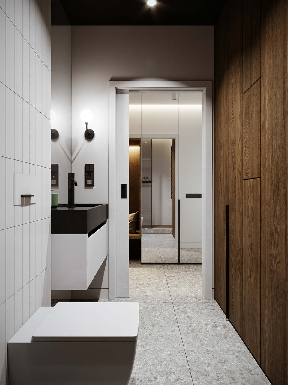 衛浴位于入門的右手邊,由于空間限制我們采用吊軌式推拉門,衛浴空間以白色為主色調,搭配黑色的五金器具,進門右手是方形簡約的黑白洗漱臺,左手邊我們安置了一個超大的防潮浴室柜,將洗衣機、烘干機安置于其中。