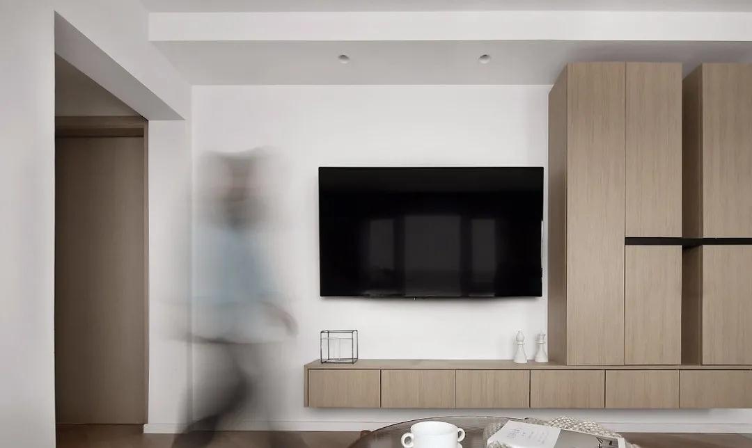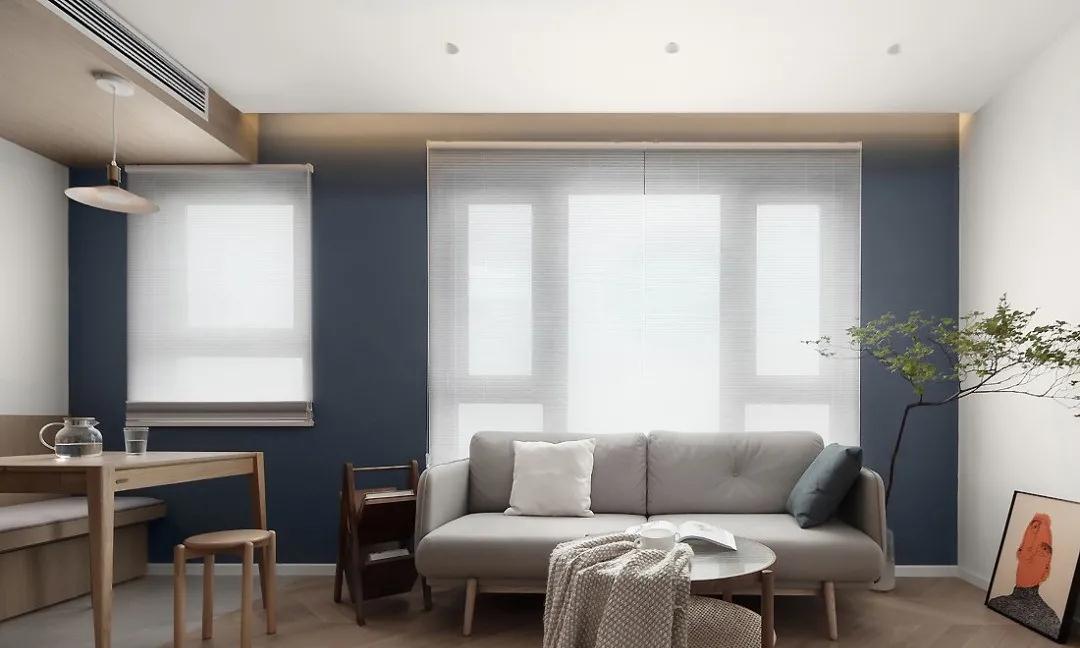 L型掛墻電視柜與白色乳膠漆墻面搭配簡單而不失格調,藍灰色沙發背景墻是空間色彩的點綴,搭配素凈的白色百葉窗簾,不需要過多的前面裝飾,便能給人輕盈而靈動的質感。