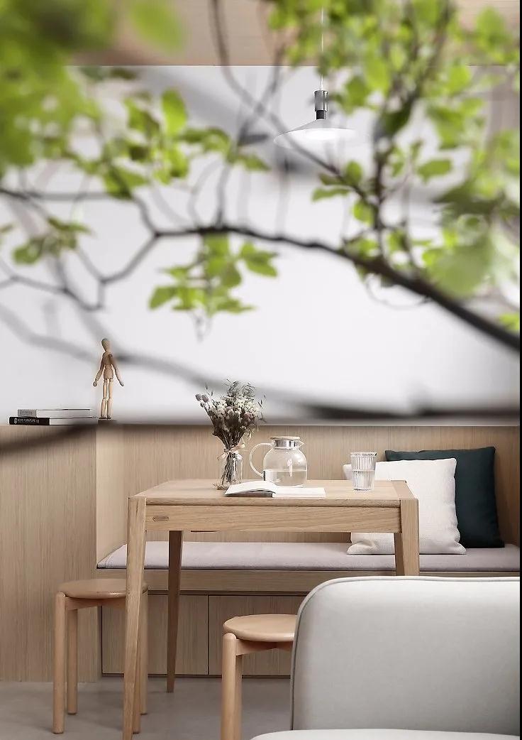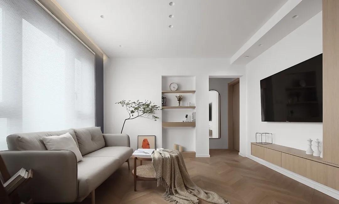 原木是日式風格的重要元素,柔白色與原木色在空間中交互融合,在給人一種置身自然的舒適感,魚骨拼的木質地板烘托出空間的質感又保留了溫馨的質感。