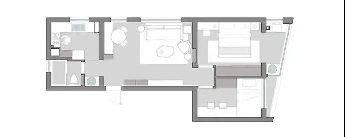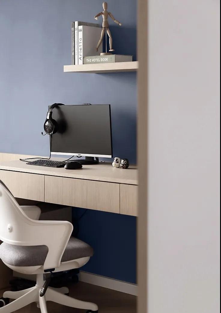 藍灰色墻面與客廳沙發背景墻色系相同,與原木色相襯干凈利落,作為書房和客臥,放上一張單人床,放置一個懸掛式書桌,整個空間寬敞明亮。