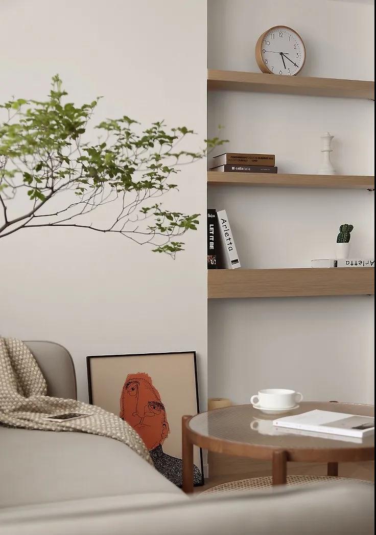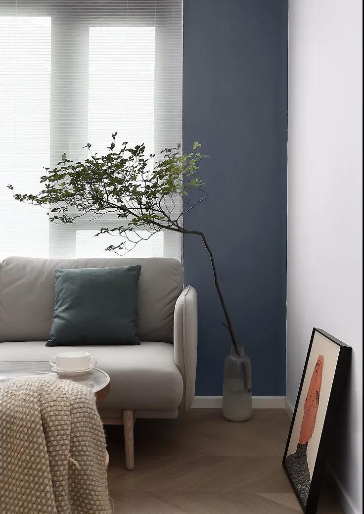 客廳的一角擺放上一枝綠植給自然的空間添加了一份綠色清新感,旁邊放上一幅橘色調的畫,以暖色增添空間的溫馨感。