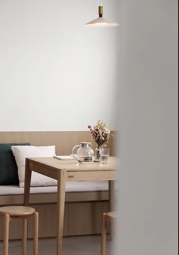 餐廳卡座做成開門式收納柜,鋪上軟墊與抱枕,提高坐感的舒適度,搭配簡單的原木色系木質餐桌,打造溫馨質樸的就餐環境。