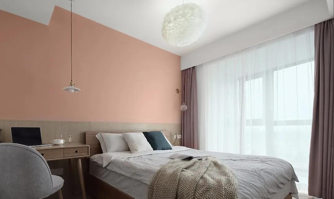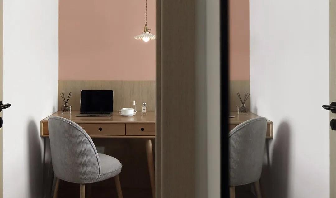 粉橘色的墻面配以金屬壁燈,高腳書桌搭配復古吊燈讓整個空間變得輕盈且溫柔,臟粉色窗簾與原木色相撞,多了幾分溫馨又讓人心動的復古感。