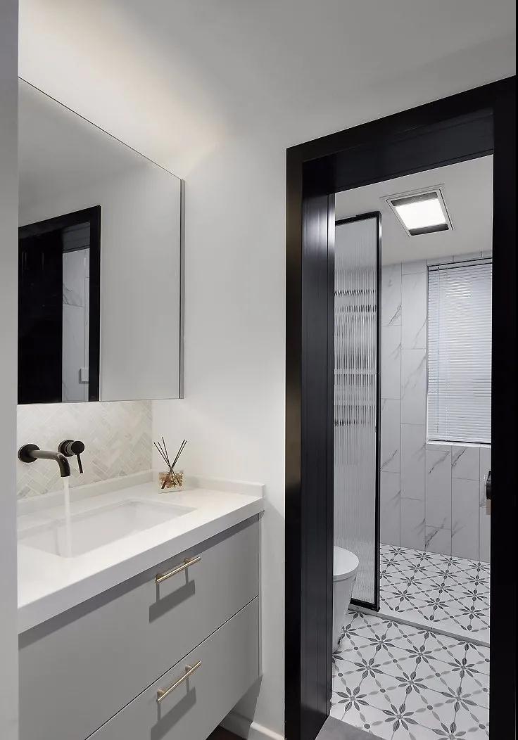 衛生間做了干濕分離,淋浴區用擋水條與一塊長虹玻璃作為隔斷,整個空間白色為主配以黑色的線條框線,不會過時的搭配,簡單而充滿高級感。