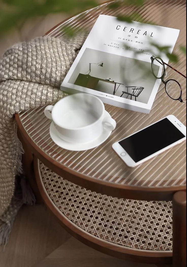 簡約的雙層圓形茶幾,上層以帶有紋理的半透明玻璃作為臺面,下層以藤編作為置物層,給人復古自然的的視覺感。