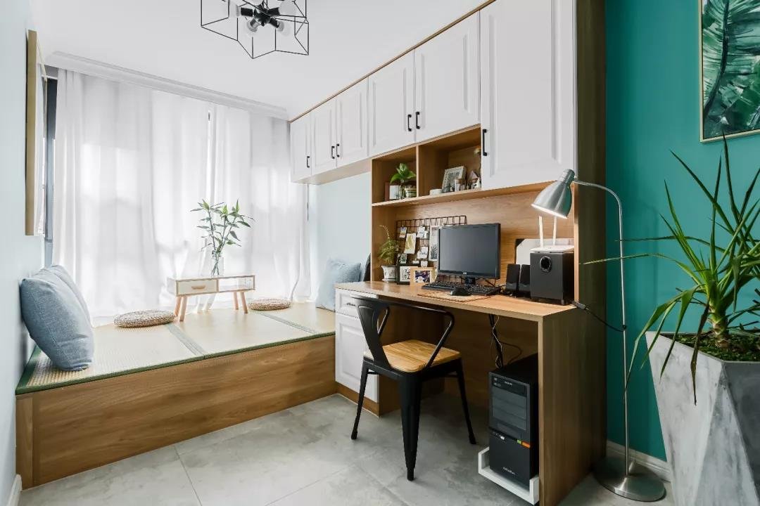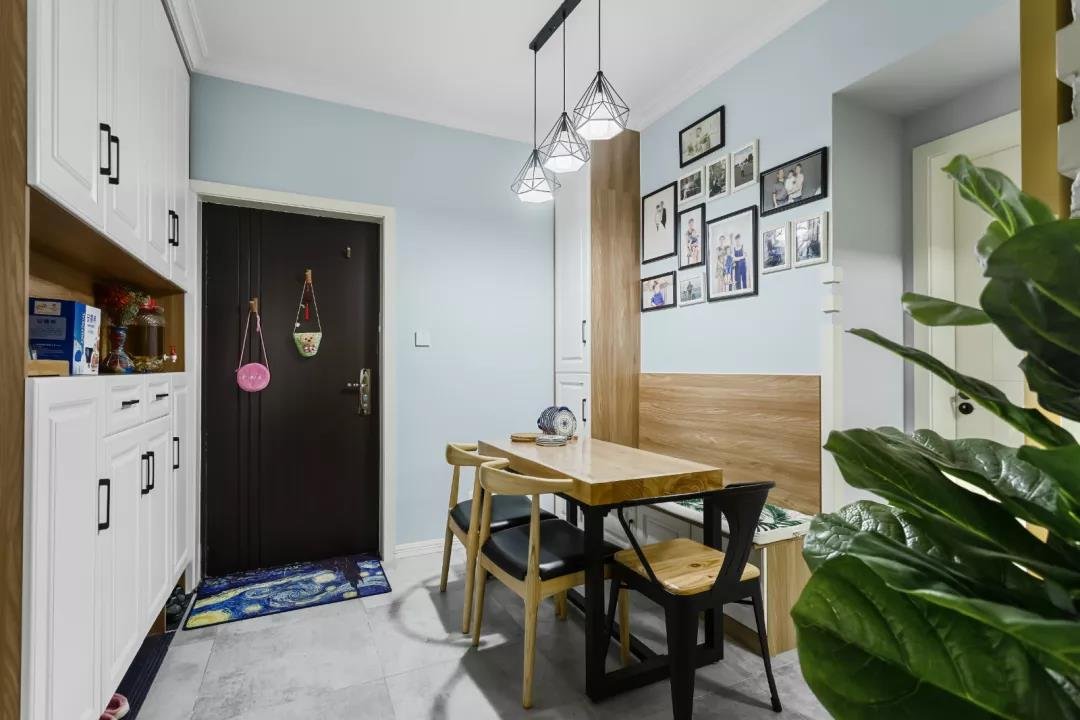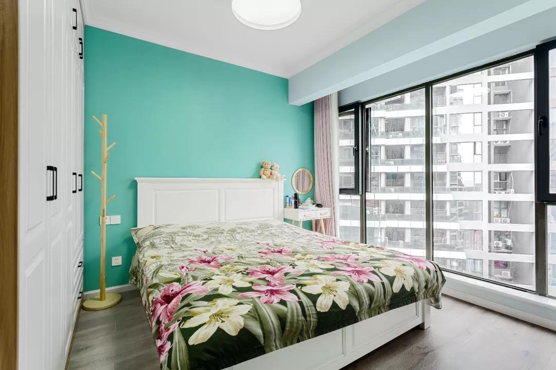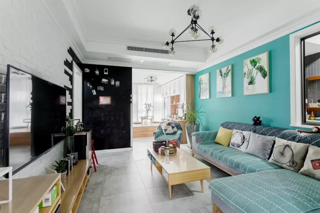 客廳使用的是帶有藍調的綠色背景墻做裝飾,搭配上合適的裝飾畫和生機勃勃的綠植,田園風閑適淡雅,清新自然的優勢,一下子就展現出來了。