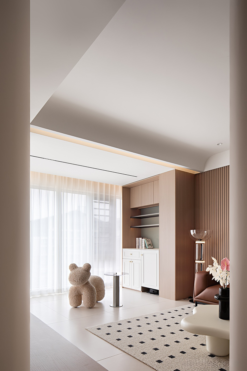 陽臺與客廳風格簡潔文藝,以木色與白色為主調,營造溫馨氛圍。木格柵柜子巧妙融入,增添儲物功能同時,彰顯自然雅致美感,展現主人獨特品味與生活情趣。