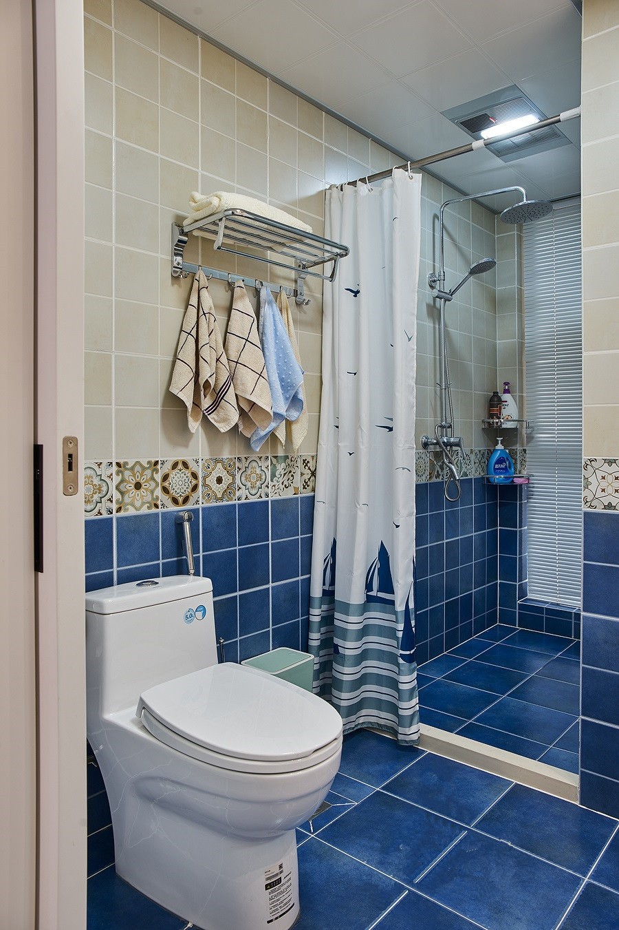 這套為三口之家準備的美式風格,風格清新,溫馨舒適,衛生間把藍色作為主色調,有一種航海出行的童心。