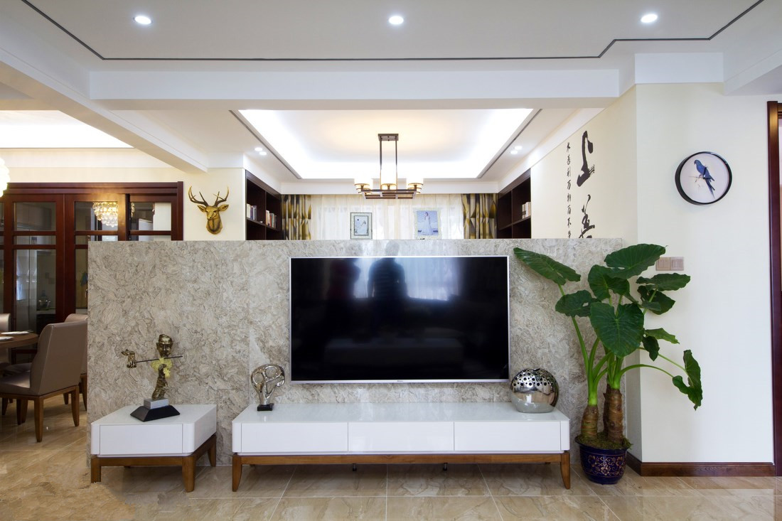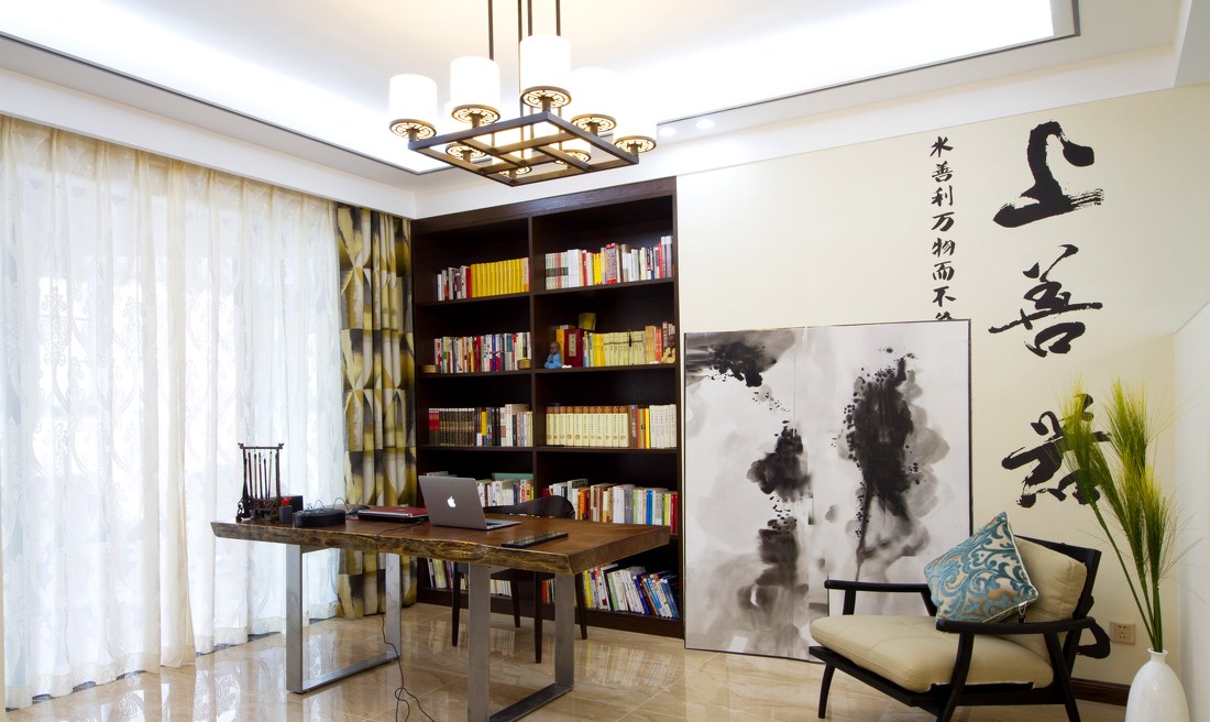后現代風格成熟穩重,最擅長雜糅其他風格的特色,融合其他風格的優勢,蘊含著一種“海納百川”的文化底蘊。所以你在這套三居室里,能看到中式風的書房,也能看到現代風的客廳。客廳和書房之間,用了一面半人高的墻做隔斷,可以說是十分突破與創新了。