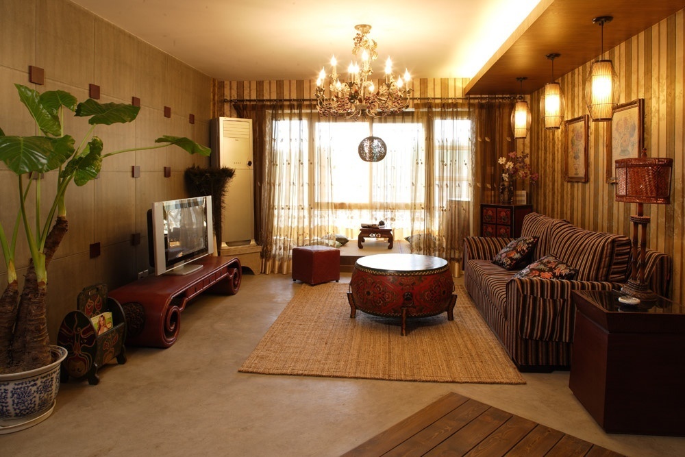 這套東南亞風格的三居室,有很多創新的設計。比如客廳里的茶幾不是常見的茶幾樣式,而是一面民族風十足的大鼓,比如臥室里的衛生間用玻璃墻作為隔斷,這都是家居裝修中比較少出現的元素,但是卻被設計師巧妙地用在了這套東南亞風格的案例中。