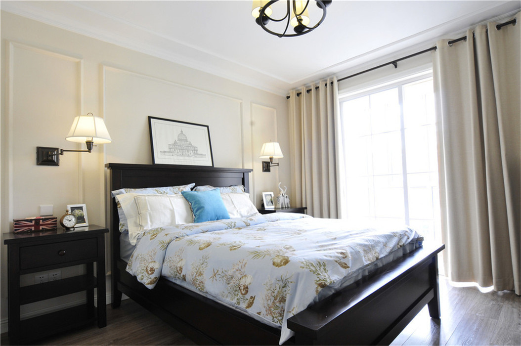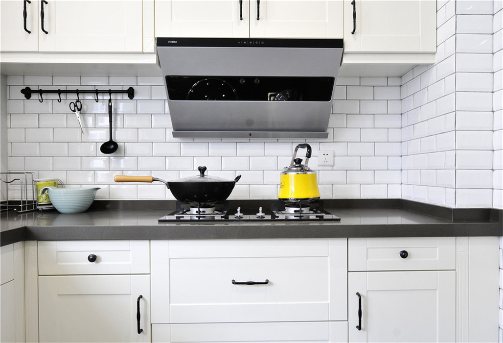 這套新古典風格形式上更為簡約,但是可以從細節上感受它的雅韻。白色的主色調能夠提亮空間,木質的家具可提升格調。廚房和衛生間都鋪設黑線白格的瓷磚,風格上有一致性,也更為時尚、美觀。