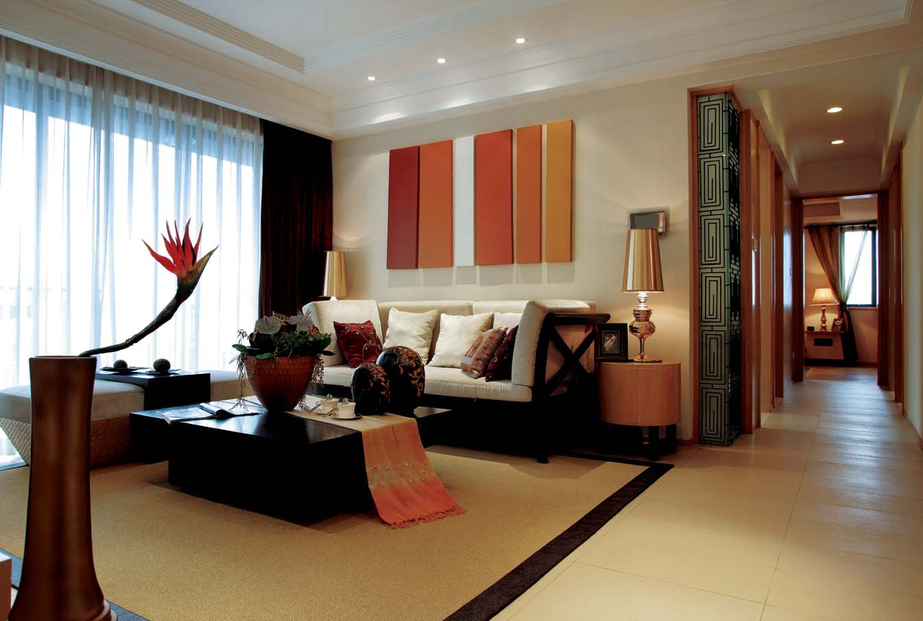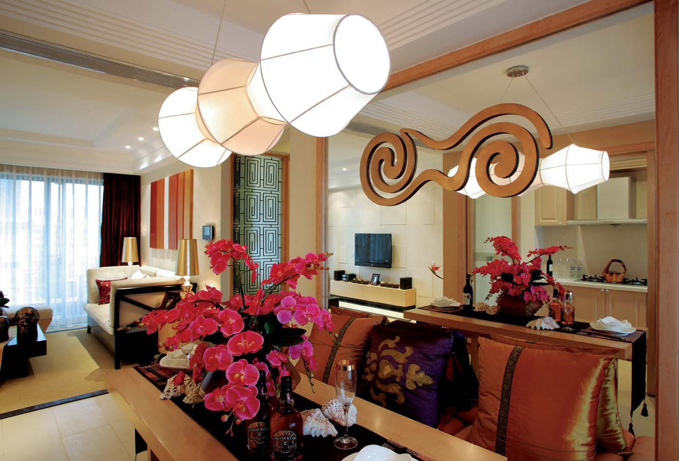 東南亞風格兼具靜謐與雅致、奔放與脫俗的特色,適合喜歡民族特色與異域風情的業主。這一套東南亞風格處處可見別出心裁的小設計,就比如餐廳背景墻上的祥云紋,就體現著一種禪意與厚重。