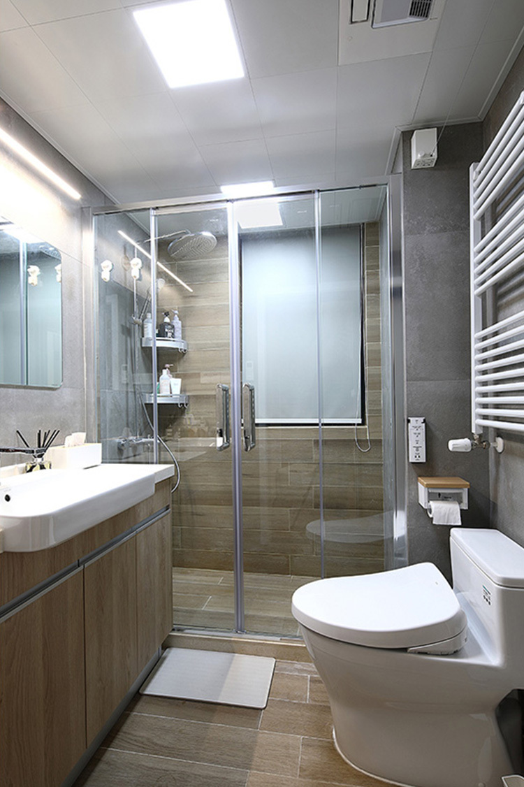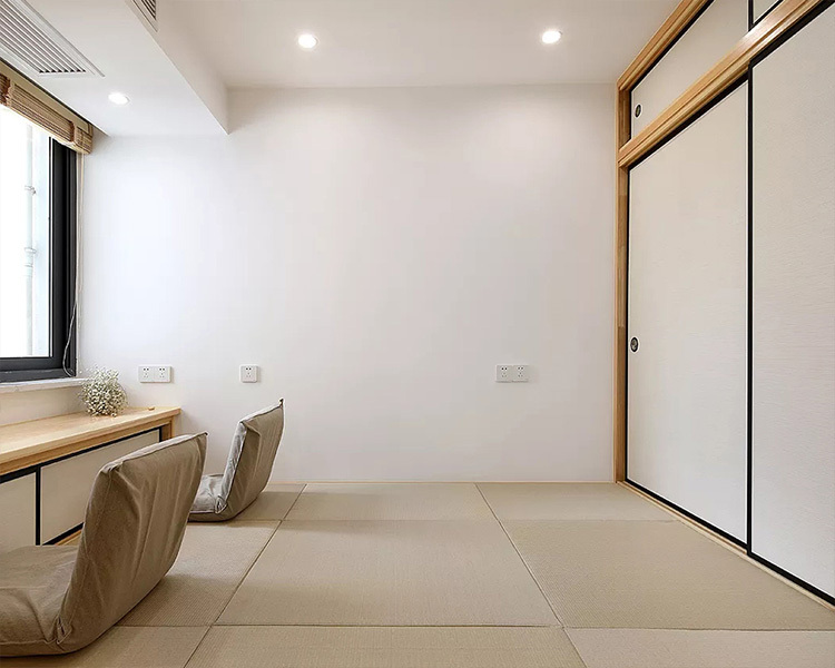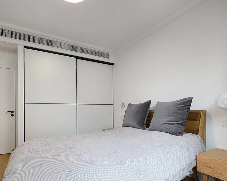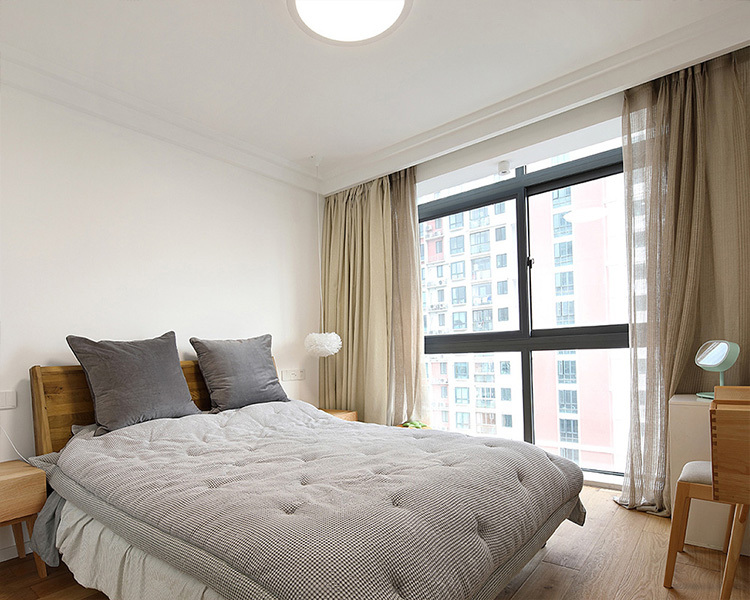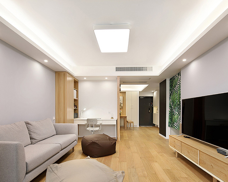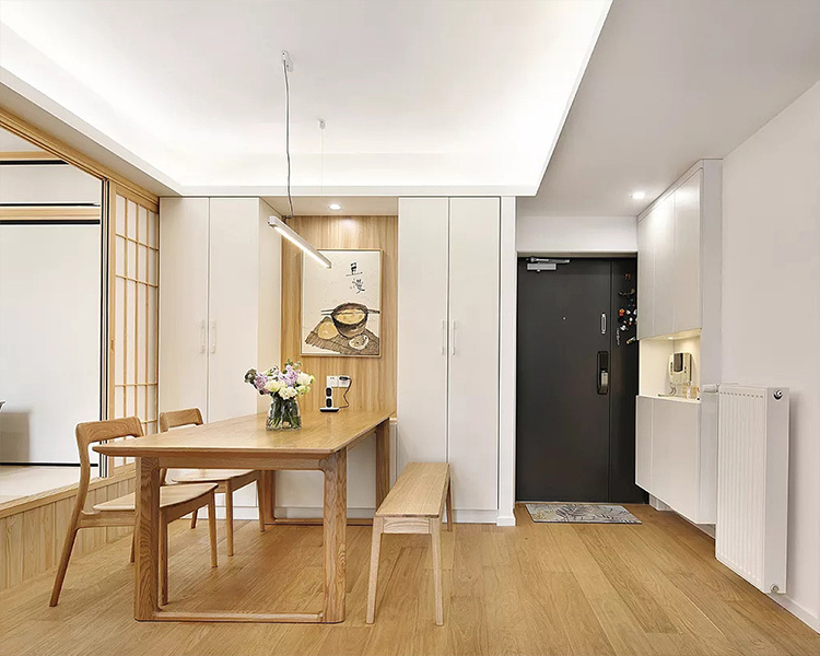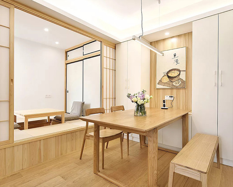業(yè)主喜歡日式的簡約,主要想法就是不想讓空間填的太滿,想要給空間留有后期改變的余地。客廳通鋪原木地板,搭配木質(zhì)電視柜以及一側(cè)的森系大掛畫,使得空間充滿清新自然的氣息。將沙發(fā)右側(cè)空間規(guī)劃成一個(gè)小書柜,很好的利用了空間。