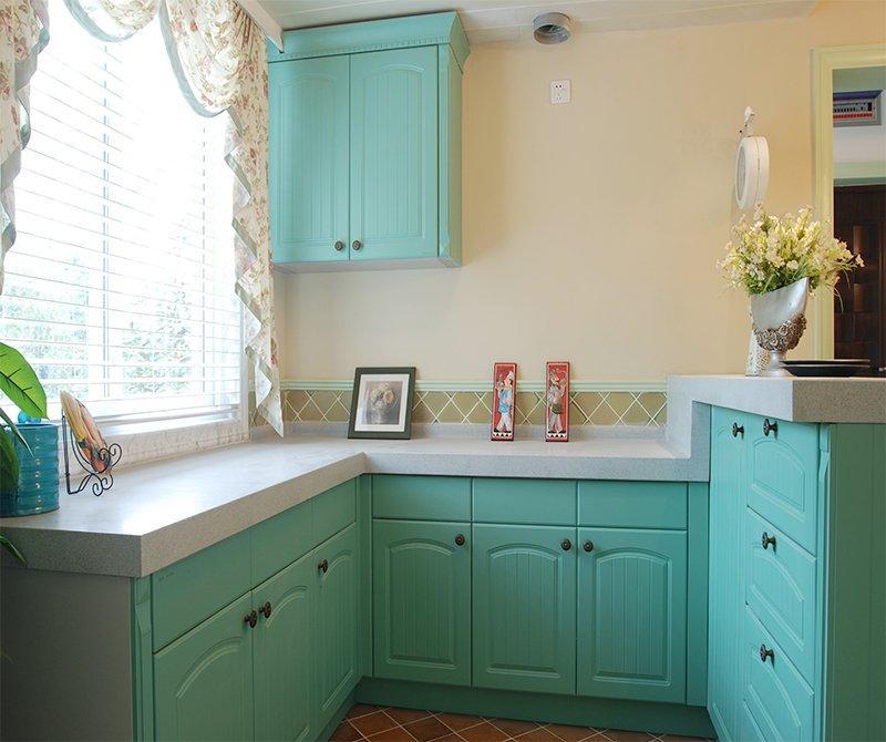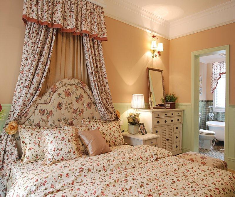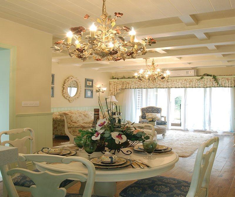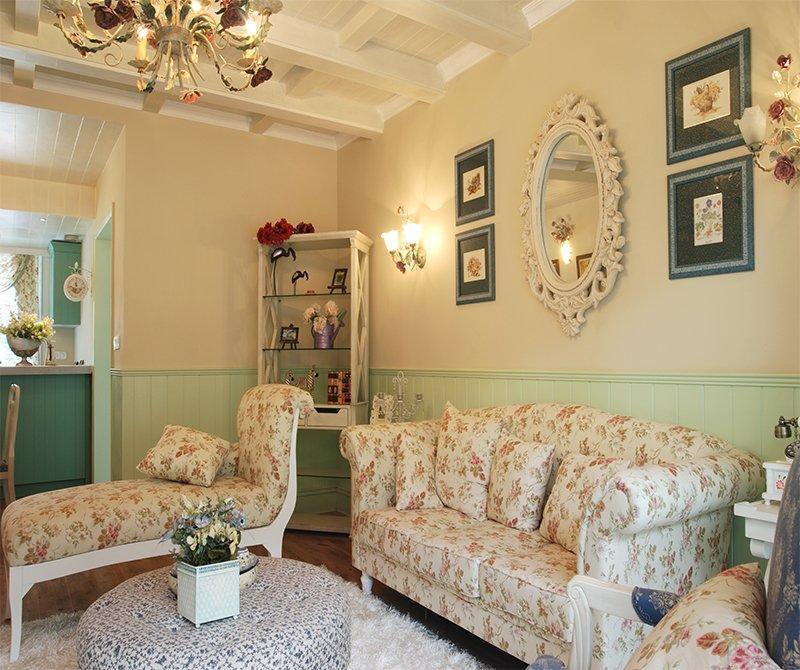 這是一套很典型的美式田園風格案例,浪漫的碎花搭配上清新的綠色,有一種田園鄉下別墅的感覺。因為客廳的面積比較小,所以設計師注重打造家居生活的溫馨感,暖黃的燈光永遠是田園風格中不可或缺的元素之一。