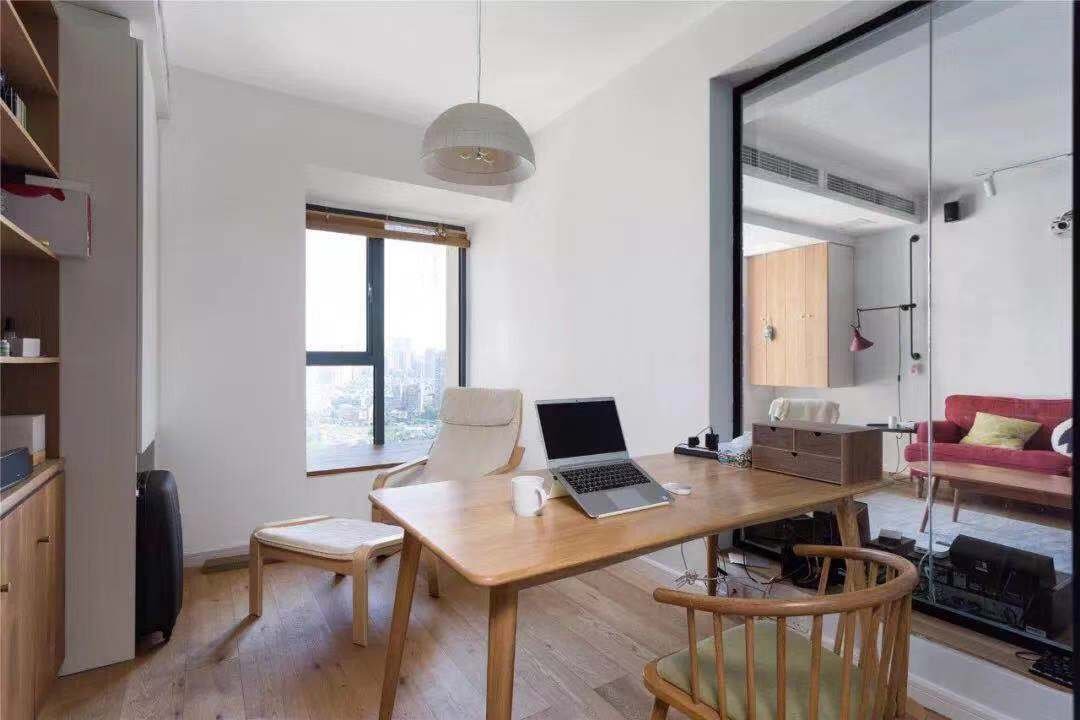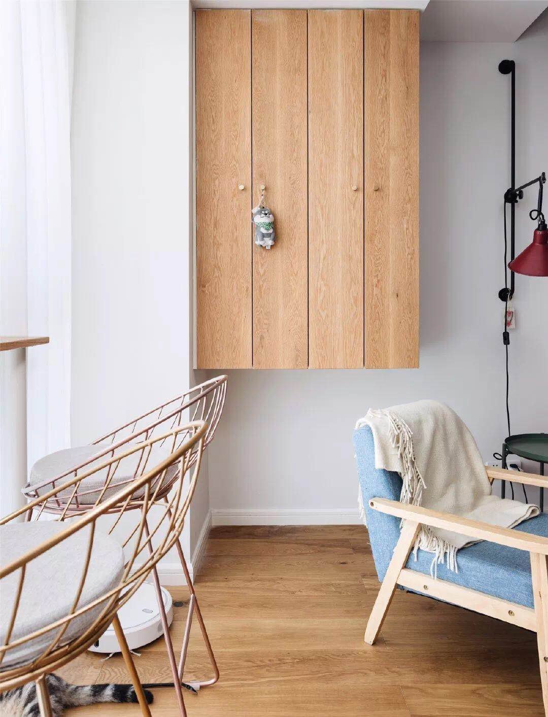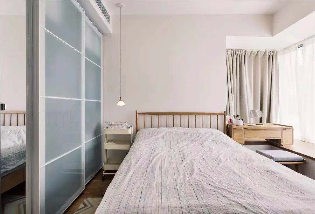 客廳沒(méi)有安裝電視機(jī),而是在天花頂藏了幕布,把陽(yáng)臺(tái)的窗簾拉上,這個(gè)客廳就能變身成小影院。臥室里是制的衣柜,用玻璃推拉門+鏡柜門取代傳統(tǒng)的木質(zhì)柜門,在視覺(jué)上可以讓空間擴(kuò)大N倍,另外床頭的一邊是梳妝臺(tái),方便女主人平時(shí)梳妝打扮。