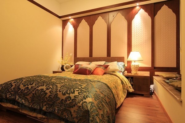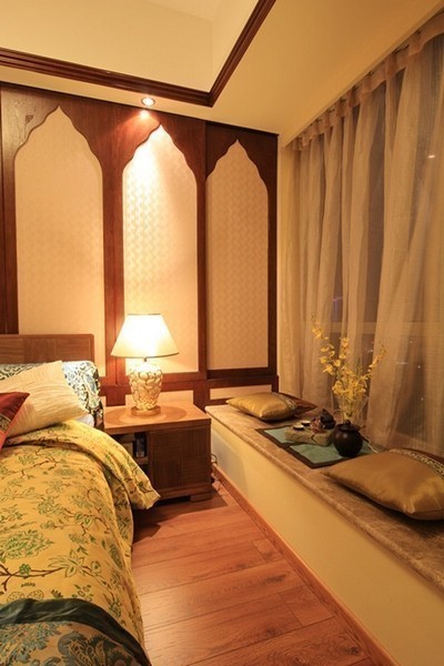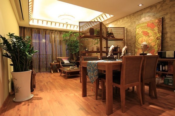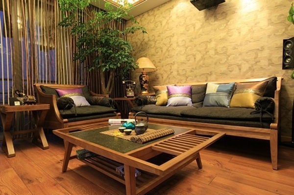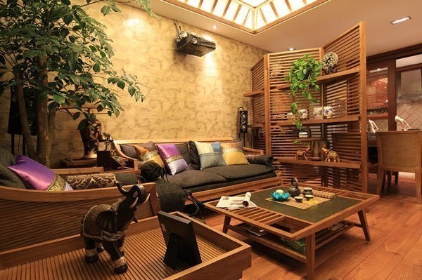 東南亞風格的裝飾熱情奔放,而且很注重保留材質的本味。客廳的家具都是木材打造,造型簡單,線條簡潔,有一種森林樹屋的氣息。客廳和陽臺之間的隔斷,是一片“竹林”,設計獨特,很有東南亞風格的特色。