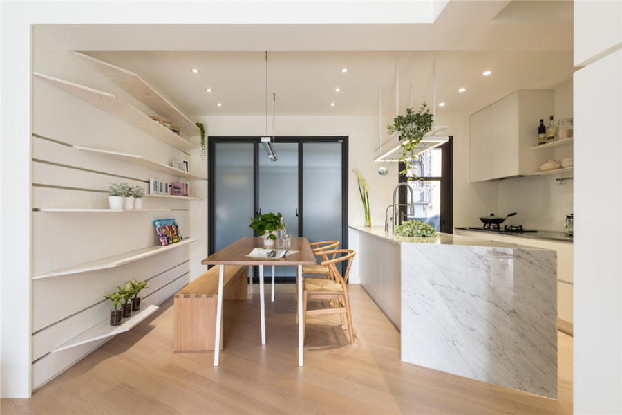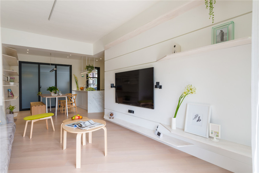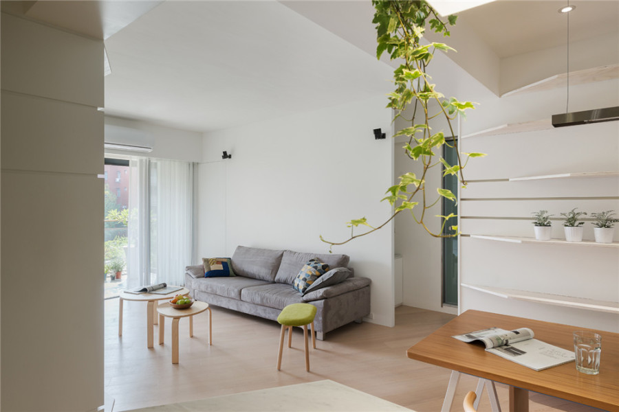 這套日式風格注重打造一種自然的氣息,客廳和餐廳隨處可見綠植,綠色、白色與原木色交相輝映,有一種森林的感覺。兒童房以藍色調為主,組合上下床的形式給兒童房的空間增添了不少趣味性,是小男孩都會喜歡的設計。