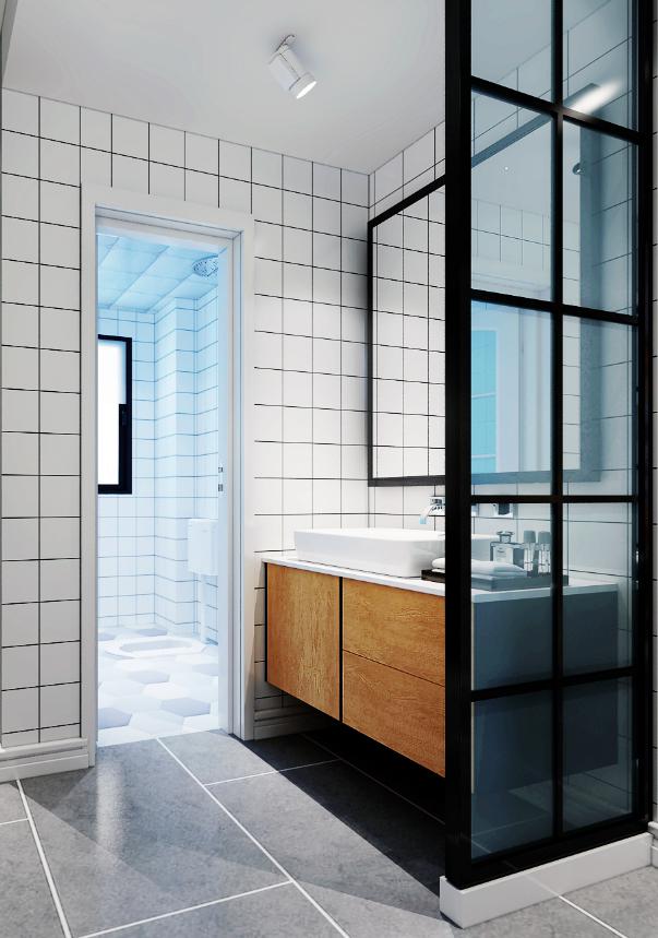 客廳和廚房都大量使用原木的家具,時尚清新,簡約自然。衛(wèi)生間干濕分離,黑框白格子的瓷磚,還帶有一點北歐風的特色。