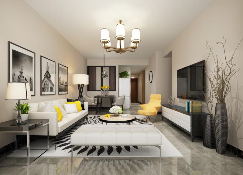 客廳的設計很有巧思,因為戶型的限制,所以并沒有給天花板安裝吊頂,只需要一盞簡單的吊燈,就足以讓整個客廳變得明亮。如果只是簡單的黑與白,就會顯得比較單調,所以設計師用一些明亮的色彩做點綴,時尚感十足。