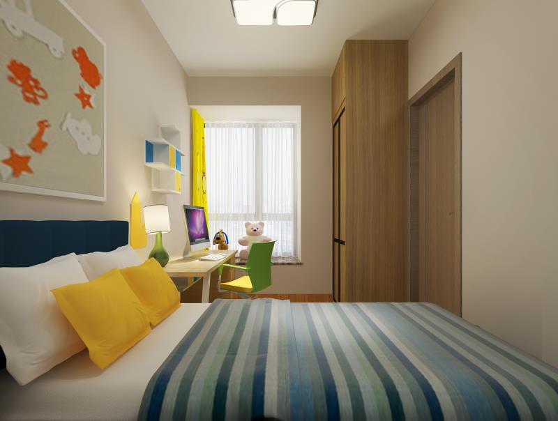 兒童房的面積比較小,所以只是簡單地擺進了一個衣柜、一張書桌和一張床,為了增加儲物面積,設計師在書桌上方還設計了造型獨特的置物架,可以用來放一些書籍或者一些工藝品。