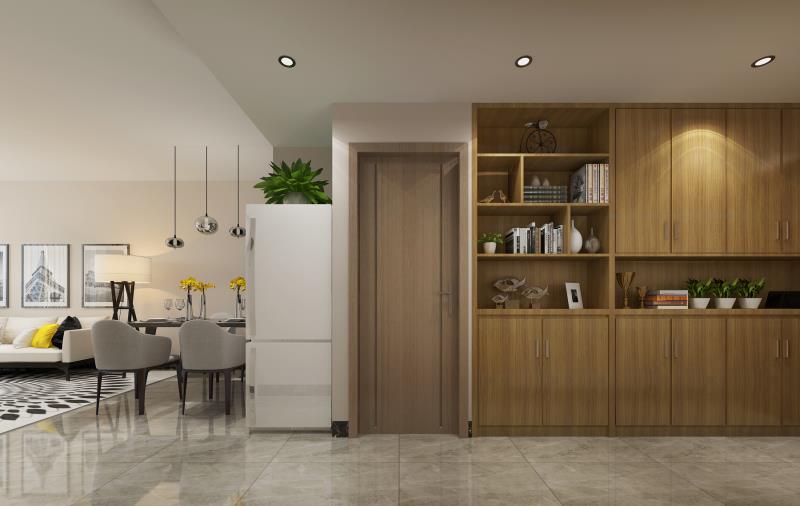 客廳和廚房之間的連接處,還有一大片空間可以利用。定制的一體式柜子滿滿當當地占據了整面墻,不浪費任何一分空間。而且柜體分為密閉的儲物區和開放的展示區,滿足多種需求,實用性很強。