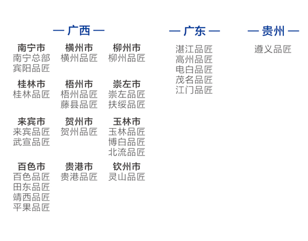 作為從南寧走向全國的桂系裝企品牌,目前已在海口、湛江、柳州、百色等多個城市開設(shè)全國直營連鎖分公司,并將以南寧為中心輻射全國設(shè)立更多品牌分公司。集團始終秉承“施人品、行匠心、成品匠”的企業(yè)理念,以一站式整裝為優(yōu)勢,以更多、更快、更好、更省的裝修裝飾理念,熱忱服務(wù)全國廣大客戶!